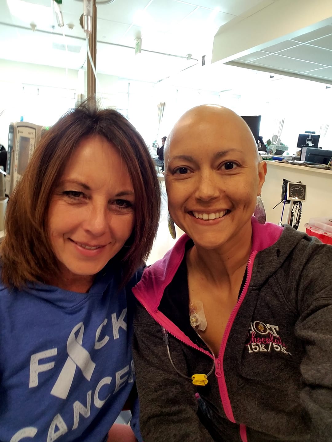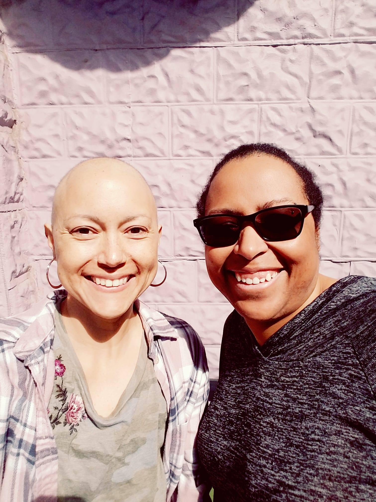 Then the AC Chemotherapy started. For me, at Stage 3, doing chemo was a no brainer. I just wanted all the cancer gone. I was pretty upset when they told me how many I was going to have to have. I cried for the second time about all of this. My first chemo session was the third time I cried. 16 sessions of chemo and 25 sessions of radiation all together starting in December 2017 and ending June 2018. I was pretty sick during chemo and got super burnt during radiation. I went from a scared girl to a baby chicken with no hair on my head, no eyebrows or lashes. The fourth time I cried was when I lost all of the hair on my head in the shower one morning. Jeremy and Liv shaved their heads with me in preparation of this. It was so much harder than I thought it was going to be. It’s just hair! But it was another thing cancer had taken away from me. 25626368_10105802920113473_4789732035760214302_o I had a lot of friends and family come with me to chemo. What a huge blessing it has been to get so much one on one time with some of my favorite people.